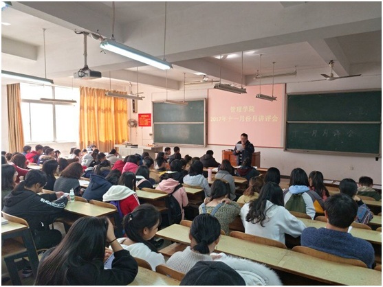 2017年11月23日中午12:10,taptap点点大一大二单学号同学,大三班委,大四班长、学委、团支书,在主校区教室内进行本学期第三次月评会议。学办辅导老师罗荃、黎博、单艳艳、包海燕、周艺、宋志航对工商管理、旅游管理、人力资源管理、会计学、物流管理、市场营销六个专业进行讲评,本月心理会议也同月评会同一时间顺利展开。