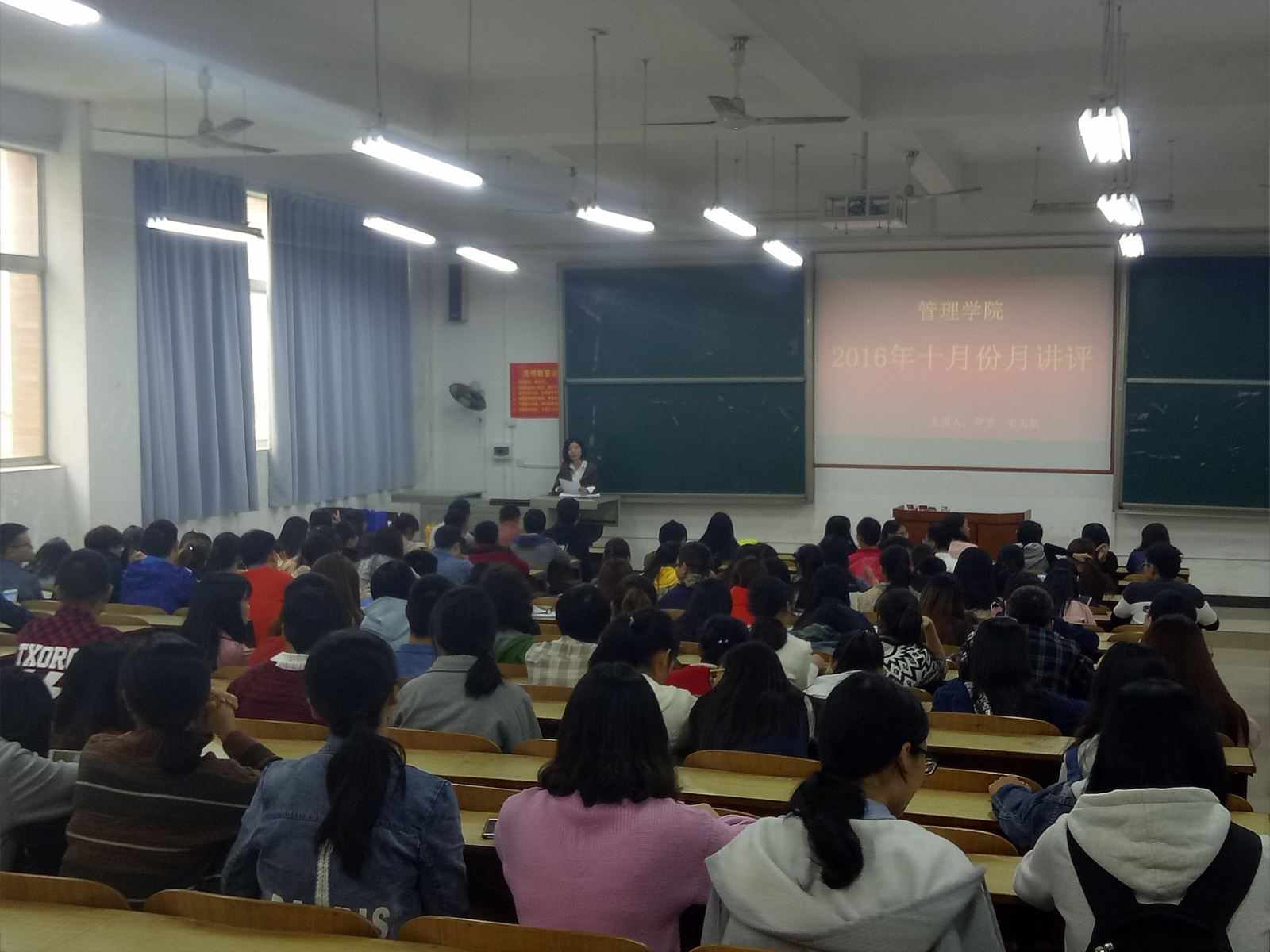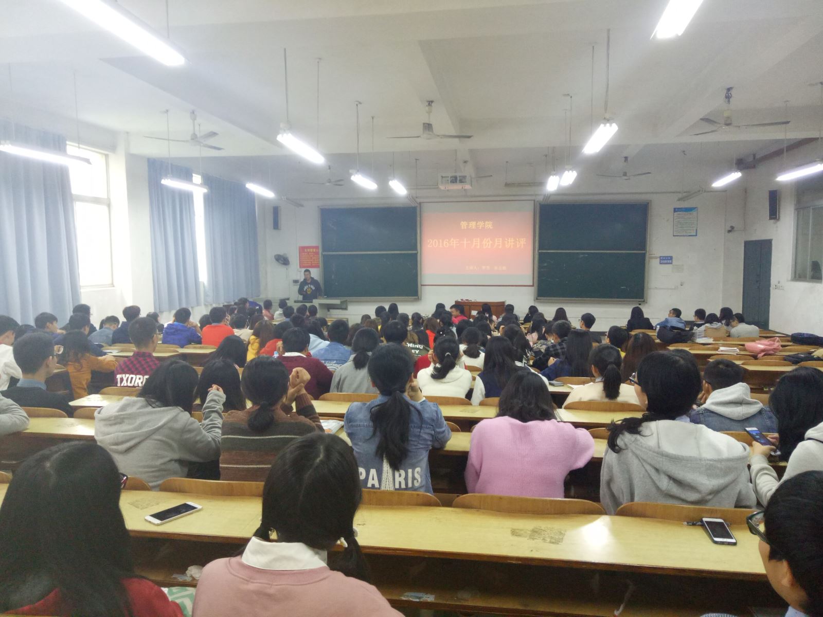 2016年10月27日中午12:30taptap点点各班班长、学习委员、团支书、主席团、部长团等在主校区D101教室进本次月评会议。管理公司党总支书记钱祖煜主持,学办辅导老师罗荃、宋志航主讲本月讲评。
