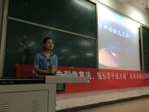 “运用典型教育法,指引学子成才路”系列活动之毕业经验交流会于6月3日晚在新校区D101拉开序幕。本次交流会特邀公司学办主任罗荃老师出席, 2015届考上研究生的学姐们为在校学子们带来了一场别开生面的交流会。