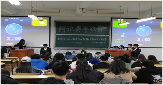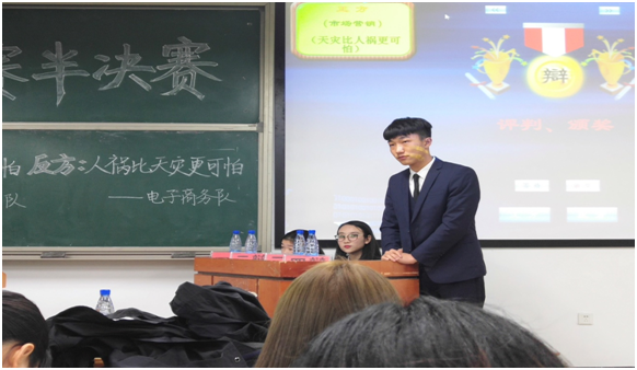 本次比赛对阵双方是正方市场营销专业与反方电子商务专业,他们就“天灾比人祸还是人祸比天灾更可怕”的辩题展开激烈的辩论,首先,正方选手在开篇立论环节提出“天灾具有不确定性与不可抗性”,气势逼人,反方选手不甘示弱,用“天灾可被预测,人祸不可被预测”反驳对方观点,双方辩手相互间进行着激烈的交锋,正方提出“任何一场天灾都会带来一定的影响”,反方接着“人祸造成的影响有多个方面”,你来我往,互不相让,在之后的环节中,他们的精彩表现更是让场下观众不禁眼前一亮。辩手们在激烈的比赛过程中都发挥了自己的才能,展现了他们良好的语言组织能力和应变能力。自由辩论环节双方辩手唇枪舌战,激情冲上云霄,竭尽全力地反击对手,更是将现场气氛推向高潮,精彩不停,掌声不断。