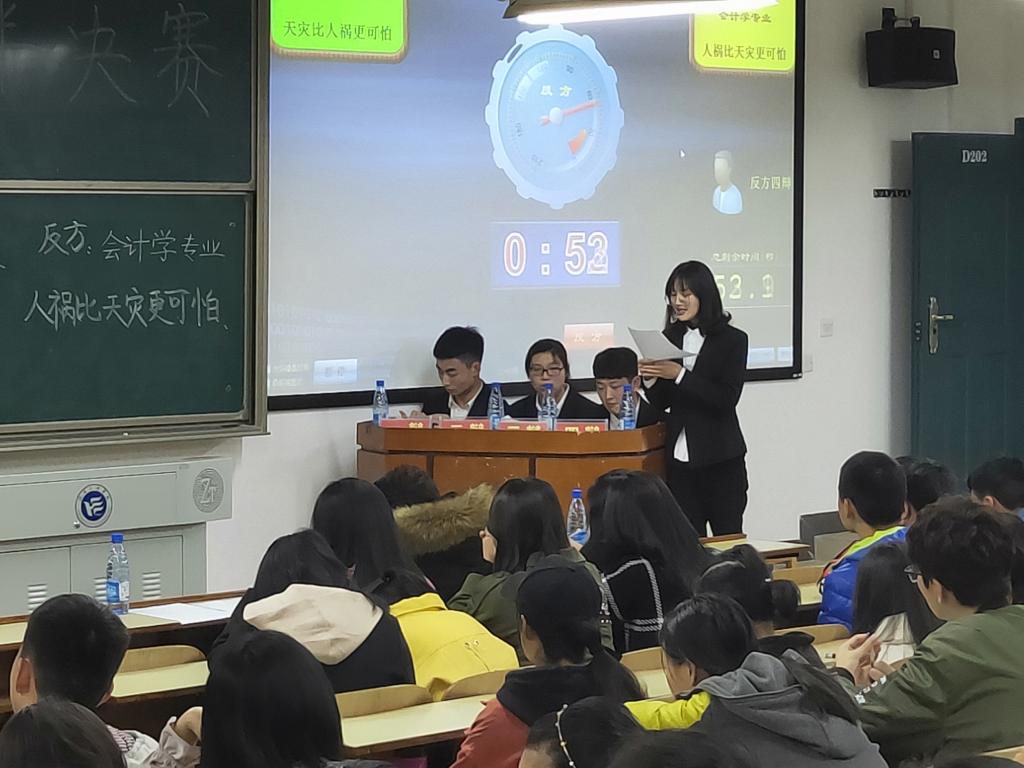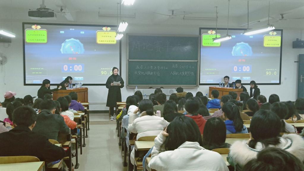 唇枪舌战,辩赛场硝烟;口若悬河,理是非曲直。为提升员工思辨能力和创造力,丰富老员工课外生活,激发员工自主思考的能力,公司的新生辩论赛已进入半决赛阶段。2019年3月12日19:00新生辩论赛半决赛第二场在教学楼D202隆重拉开帷幕。进入半决赛的两个专业是一路过关斩将的人力资源管理专业和会计学专业,人力资源管理专业为正方,会计学专业为反方,引起激烈辩论的辩题是“天灾比人祸/人祸比天灾更可怕”,担任本场辩论赛的评委是taptap点点校队成员李煌明、taptap点点辩论队成员蔡志娟、taptap点点辩论队成员顾成雪。