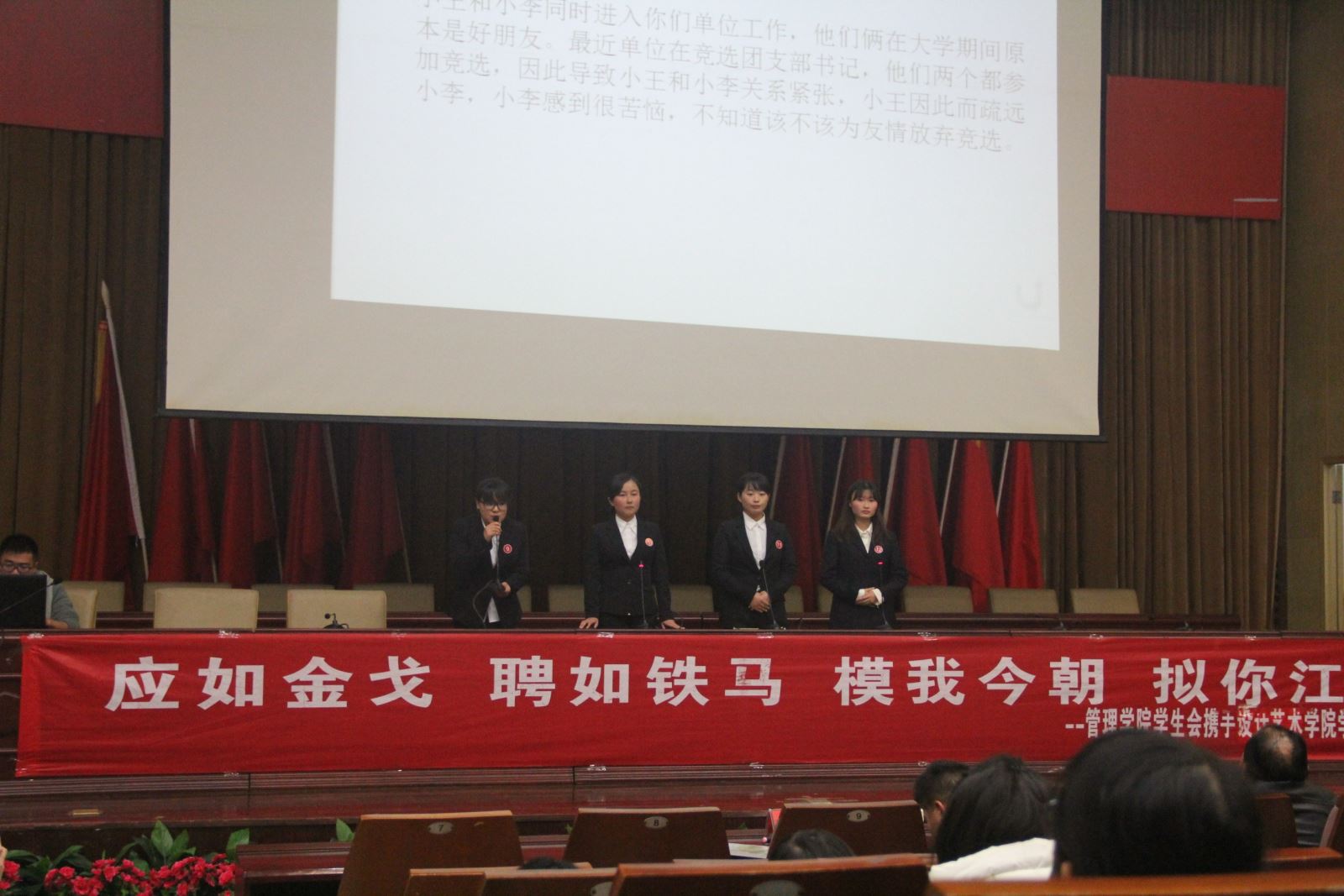 本次半决赛比赛内容为个人职业规划展示和情景模拟。选手们从自身情况出发,结合职业前景和环境,向大家展示自己的职业规划。选手们的职业规划真是各有千秋,难分伯仲。同时,选手们四人一组,在随机挑选的情景中,积极表达自己对事情的看法,展现自己与他人的沟通能力,并且展示了自己处理事情的方法经验。比赛间隙的互动环节更是将现场的气氛推到高潮。经过激烈的竞争后, 谢雄奇,王翔,尹跃霖,王阿茹,陈佳慧,范兴华,蒋玲婷,王任,唐峦平,李夏仪,姜柳,张楠等12位选手进入决赛。