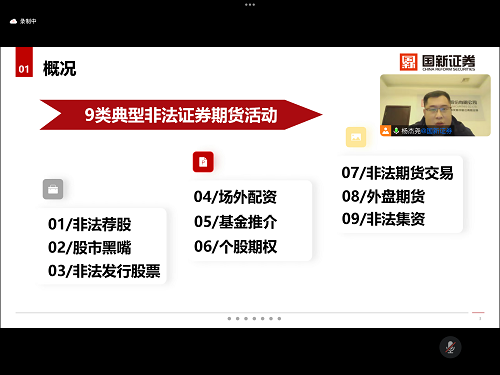 为提高员工对非法证券期货活动的了解,防止员工因对非法证券期货活动的认知欠缺而上当受骗、造成损失。经济公司于2023年12月11日晚上19:00在腾讯会议app组织开展了“识别、防范非法证券期货活动”防诈培训会,本次培训由国新证券投资顾问杨杰尧主讲,22级全体员工参加活动。