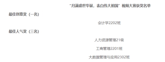 在员工联合组织宣传部的组织下,各班级积极响应号召,踊跃报名投稿。同学们充分发挥自己的创造力,在视频形式和内容上进行了大胆创新,制作出了许多富有个性、充满温度、饱含灵感的优秀作品。其中,会计学2202班以无限的青春活力,表达对祖国未来的美好期待和奋发向前的决心;工商管理2201班通过展现祖国的壮丽山河、繁荣城市、灿烂文化,来表达时代青年对祖国的热爱与赞叹;21级人力资源管理专业通过讲述感人故事,传递出对祖国的感恩之情。